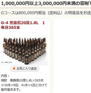 都城市に100万円以上寄付をすると、黒霧島が1年分貰えます。この1年というのは1日1合とかじゃないですよ、1日1升です! つまり一升瓶が365本(80万円相当)も送られてきます。